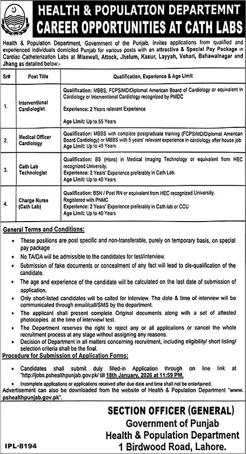 Health & Population Department, Government of the Punjab, Invites applications from qualified and experienced individuals domiciled Punjab for various posts with an attractive & Special Pay Package in Cardiac Catheterization Labs at Mianwali, Attock, Jhelum, Kasur, Layyah, Vehari, Bahawalnagar and Jhang as detailed below:-