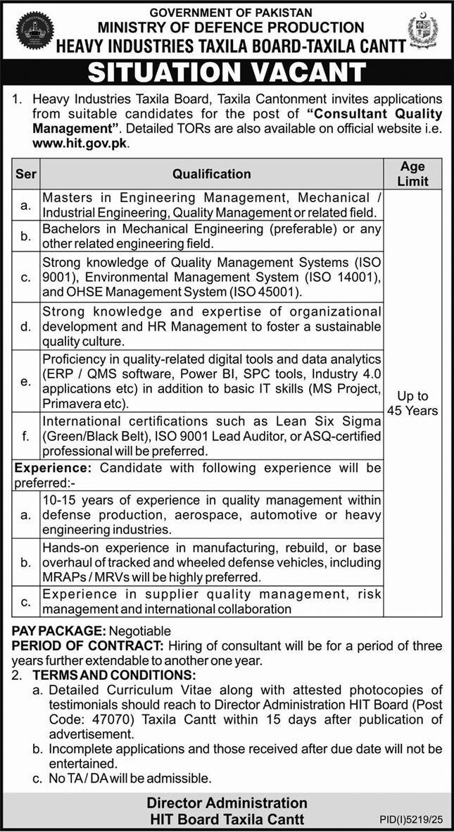 Heavy Industries Taxila Board HIT Jobs 2026 announce the Contract career opportunities for the post of See Below Ad in Punjab for the fresh and experienced candidates on Contract basis who have Check Advertisement degree. Posted date of this post is 25/12/2025 and the last date is 08/01/2026. if you are eligible for this job apply before due date.