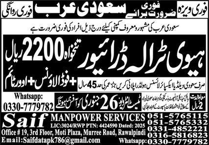 Heavy Traila Driver & Driver Jobs 2026 In Saudi Arabia announce the Contract career opportunities for the post of See Below Ad in Saudi Arabia for the fresh and experienced candidates on Contract basis who have Check Advertisement degree. Posted date of this post is 23/01/2026 and the last date is 26/01/2026. if you are eligible for this job apply before due date.
