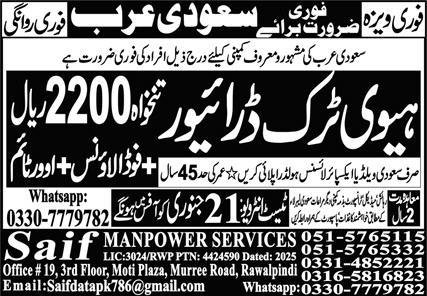 Heavy Truck Drive Jobs in Saudia Arabia 2026 announce the Contract career opportunities for the post of See Below Ad in Saudi Arabia for the fresh and experienced candidates on Contract basis who have Check Advertisement degree. Posted date of this post is 20/01/2026 and the last date is 21/01/2026. if you are eligible for this job apply before due date.