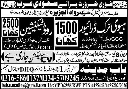 Heavy Truck Driver & Road Technician Jobs 2026 announce the Contract career opportunities for the post of See Below Ad in Saudi Arabia for the fresh and experienced candidates on Contract basis who have Check Advertisement degree. Posted date of this post is 31/01/2026 and the last date is 07/02/2026. if you are eligible for this job apply before due date.