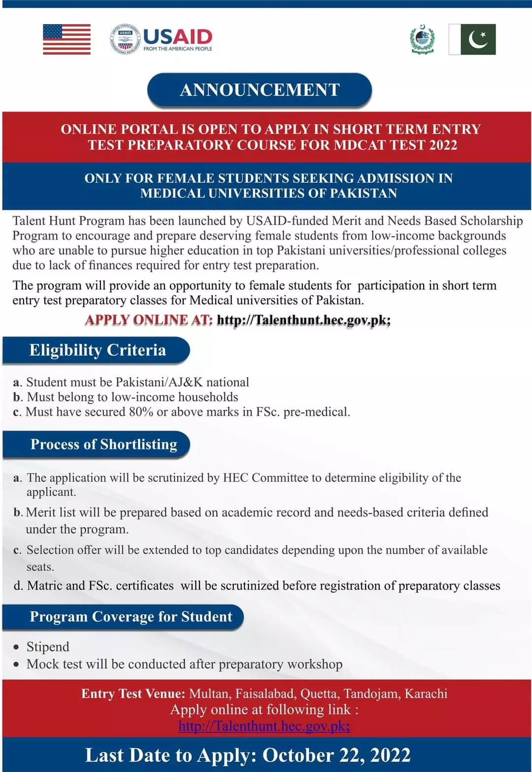 HEC MDCAT Talent Hunt Program 2022 announce the Contract career opportunities for the post of See Below Ad in Federal,Islamabad for the fresh and experienced candidates on Contract basis who have Check Advertisement degree. Posted date of this post is 13/10/2022 and the last date is 22/10/2022. if you are eligible for this job apply before due date.