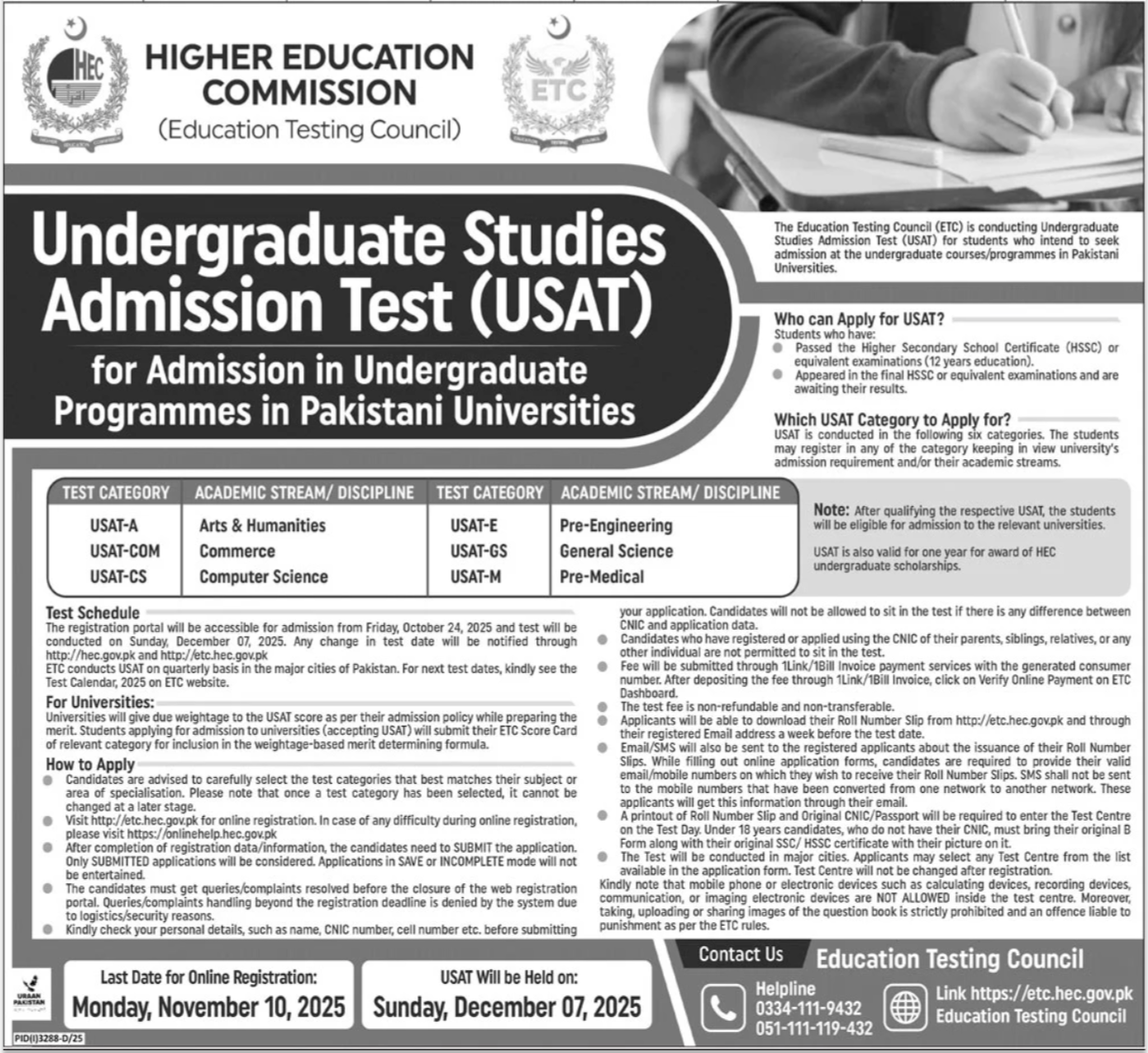 Higher Education Commission HEC Admission Test 2025 announce the Contract career opportunities for the post of See Below Ad in Federal, Islamabad for the fresh and experienced candidates on Contract basis who have Check Advertisement degree. Posted date of this post is 23/10/2025 and the last date is 10/11/2025. if you are eligible for this job apply before due date.