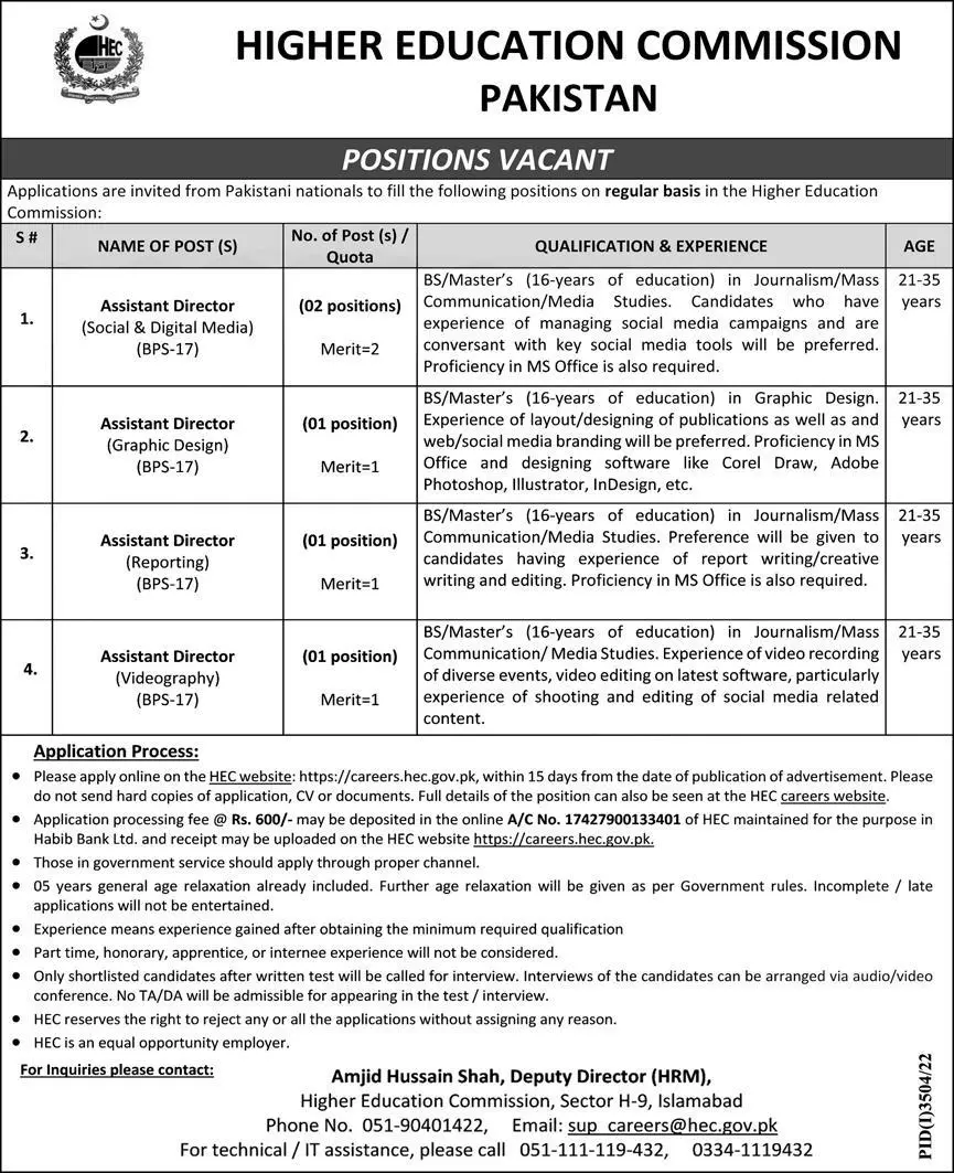 Higher Education Commission Islamabad Jobs 2022 announce the Contract career opportunities for the post of See Below Ad in Federal, Islamabad for the fresh and experienced candidates on Contract basis who have Check Advertisement degree. Posted date of this post is 04/12/2022 and the last date is 19/12/2022. if you are eligible for this job apply before due date.