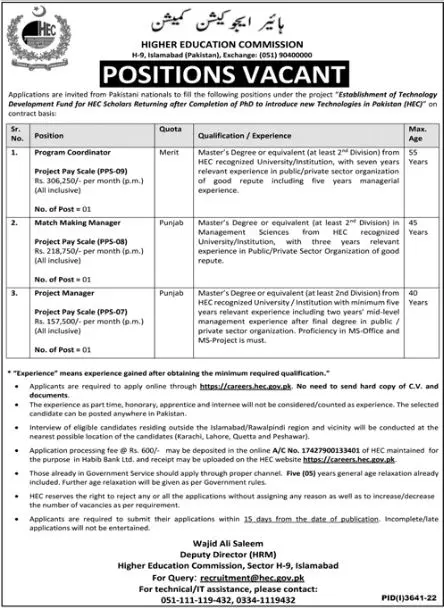 Candidates should submit applications online at https://careers.hec.gov.pk OR .