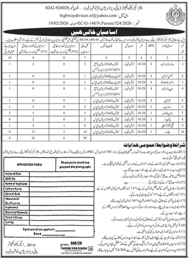 Highways Division Naushahro Feroze Jobs 2026 announce the Contract career opportunities for the post of See Below Ad in Sindh, Karachi for the fresh and experienced candidates on Contract basis who have Check Advertisement degree. Posted date of this post is 20/02/2026 and the last date is 07/03/2026. if you are eligible for this job apply before due date.