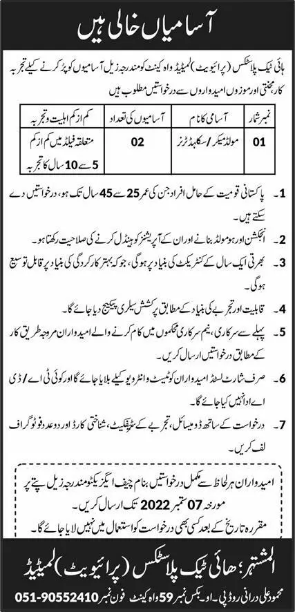 Full Time Expected Last Date: 07 September, 2022or as per paper ad Latest Hi Tech Plastics Pvt Limited Engineering Posts Wah Cantt 2022 Hi Tech Plastics Engineering wah cantt Punjab Pakistan invites applications from eligible candidates for the post of mould maker, turner and skilled turner as per advertisement of August 24, 2022 published in daily Express Newspaper.