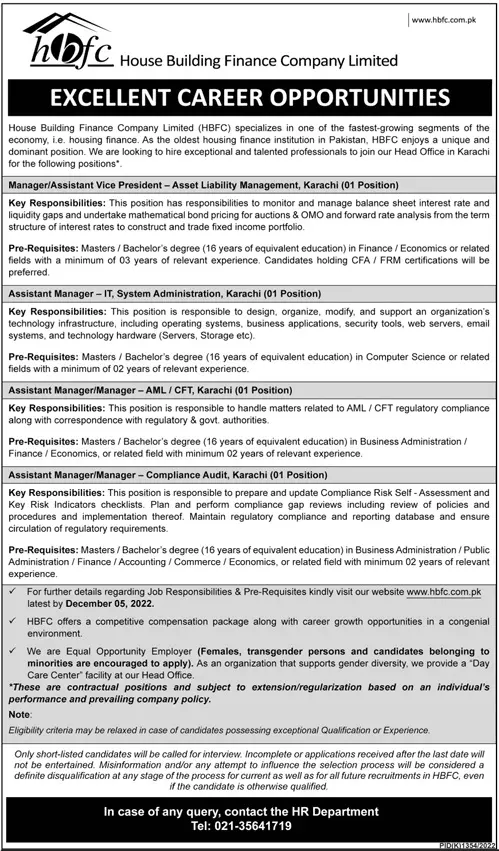 Housing Buildings Finance Company Limited Jobs 2022 announce the Contract career opportunities for the post of See Below Ad in Sindh, Karachi for the fresh and experienced candidates on Contract basis who have Check Advertisement degree. Posted date of this post is 20/11/2022 and the last date is 05/12/2022. if you are eligible for this job apply before due date.