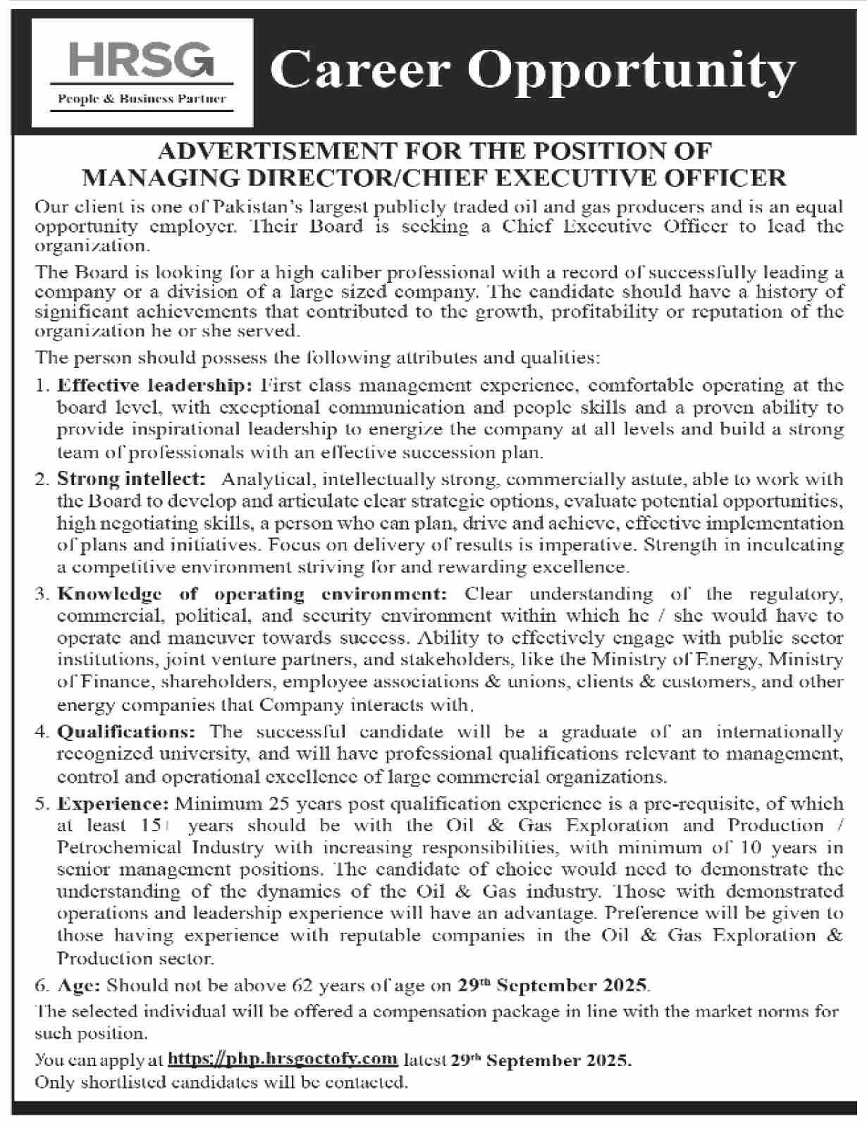 HRSG People & Business Partnering Karachi Jobs 2025 announce the Contract career opportunities for the post of See Below Ad in Sindh, Karachi for the fresh and experienced candidates on Contract basis who have Check Advertisement degree. Posted date of this post is 14/09/2025 and the last date is 29/09/2025. if you are eligible for this job apply before due date.