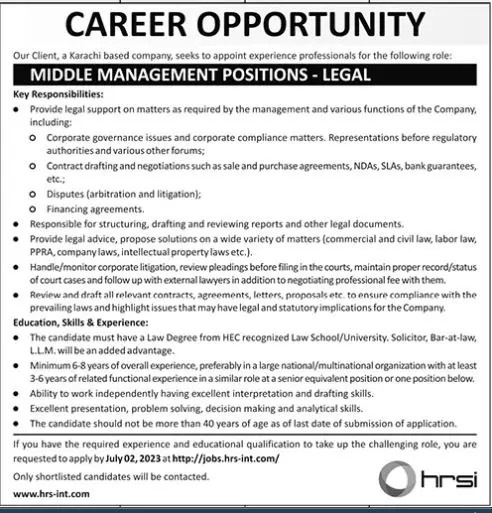 HRSI Company Jobs 2023 In Karachi announce the Contract career opportunities for the post of See Below Ad in Sindh, Karachi for the fresh and experienced candidates on Contract basis who have Check Advertisement degree. Posted date of this post is 18/06/2023 and the last date is 02/07/2023. if you are eligible for this job apply before due date.