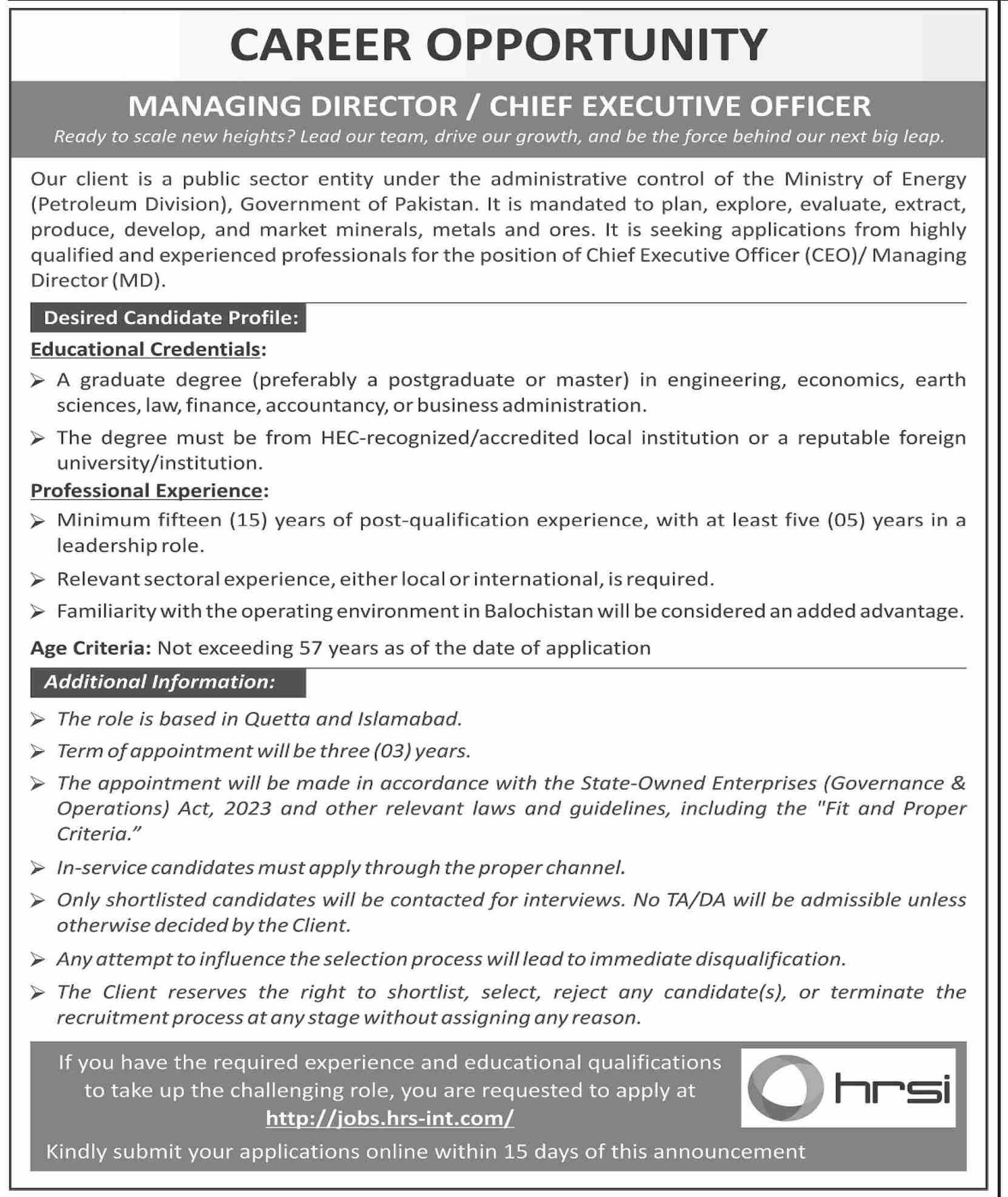 Human Resource Solution International HRSI Karachi Job 2025 announce the Contract career opportunities for the post of See Below Ad in Sindh, Karachi for the fresh and experienced candidates on Contract basis who have Check Advertisement degree. Posted date of this post is 21/09/2025 and the last date is 06/10/2025. if you are eligible for this job apply before due date.