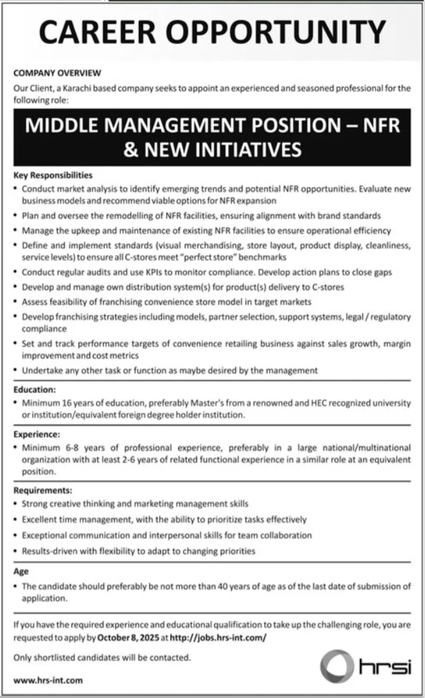 Human Resource Solution International HRSI Karachi Job 2025 announce the Contract career opportunities for the post of See Below Ad in Sindh, Karachi for the fresh and experienced candidates on Contract basis who have Check Advertisement degree. Posted date of this post is 24/09/2025 and the last date is 08/10/2025. if you are eligible for this job apply before due date.