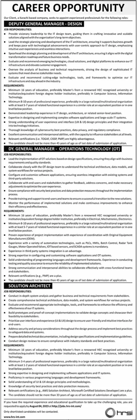 Human Resource Solution International Karachi Jobs 2023 announce the Contract career opportunities for the post of See Below Ad in Sindh,Karachi for the fresh and experienced candidates on Contract basis who have Check Advertisement degree. Posted date of this post is 21/07/2023 and the last date is 04/08/2023. if you are eligible for this job apply before due date.