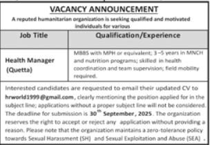 Health Manager (Quetta) | MBBS with MPH or equivalent; 3-5 years in MNCH and nutrition programs; skilled in health coordination and team supervision; field mobility required.