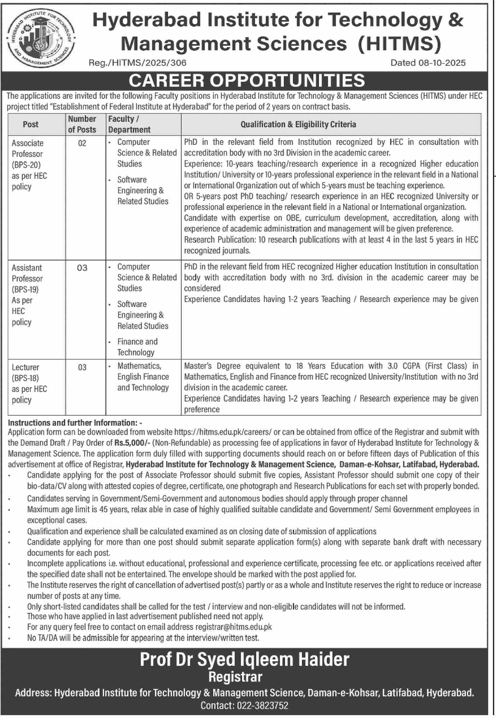 The applications are invited for the following Faculty positions in Hyderabad Institute for Technology & Management Sciences (HITMS) under HEC project titled "Establishment of Federal Institute at Hyderabad" for the period of 2 years on contract basis.