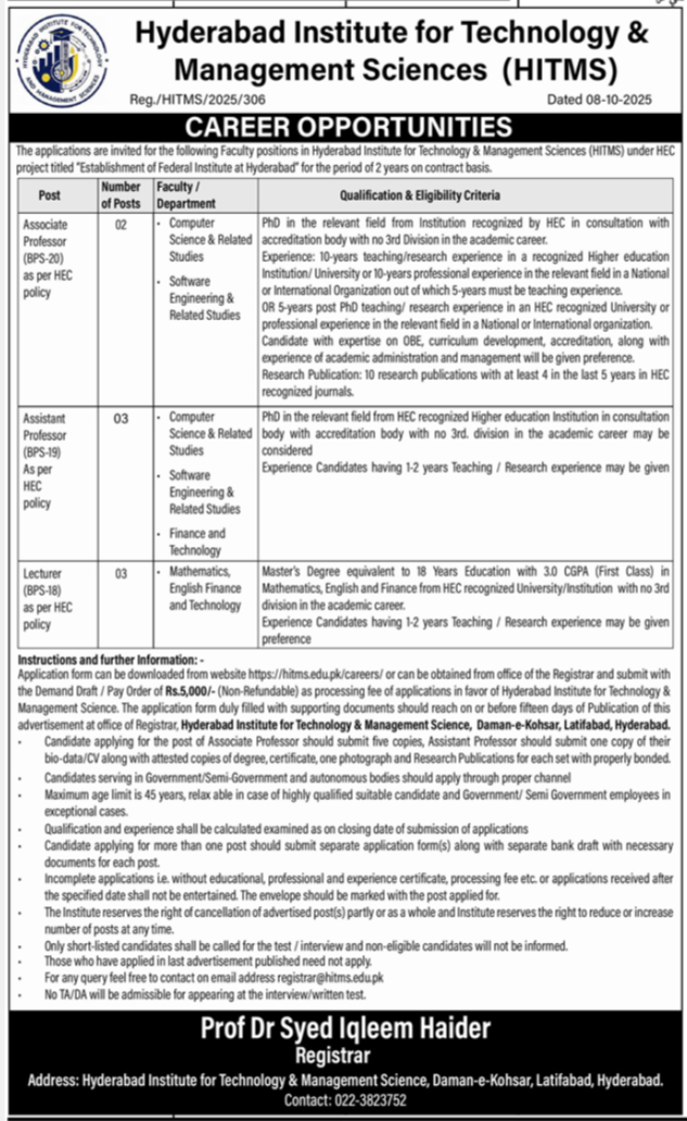 Hyderabad Institute Of Technology & Management Sciences Jobs announce the Contract career opportunities for the post of See Below Ad in Sindh, Hyderabad for the fresh and experienced candidates on Contract basis who have Check Advertisement degree. Posted date of this post is 10/10/2025 and the last date is 25/10/2025. if you are eligible for this job apply before due date.