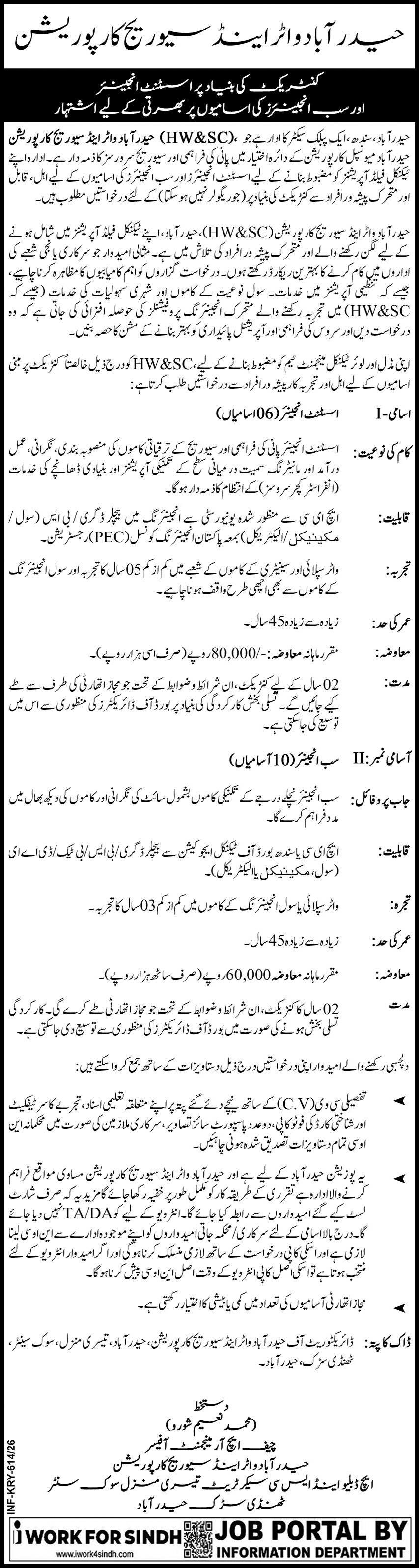 Hyderabad Water & Sewerage Corporation HW&SC Jobs 2026 announce the Contract career opportunities for the post of See Below Ad in Sindh, Hyderabad for the fresh and experienced candidates on Contract basis who have Check Advertisement degree. Posted date of this post is 19/02/2026 and the last date is 05/03/2026. if you are eligible for this job apply before due date.