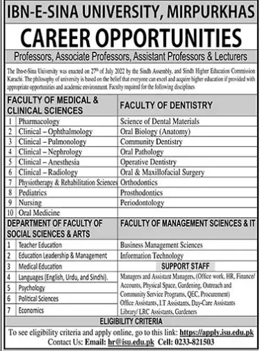 - Read complete ad online to know how to apply on latest Ibn e Sina University job opportunities.