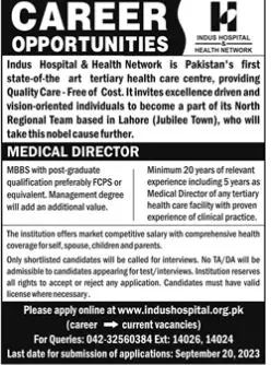 Indus Hospital & Health Network Lahore, lahore Punjab Pakistan invites applications from eligible candidates for the post of medical director as per advertisement of September 10, 2023 published in daily The News Newspaper. Educational qualifications required MBBS etc.