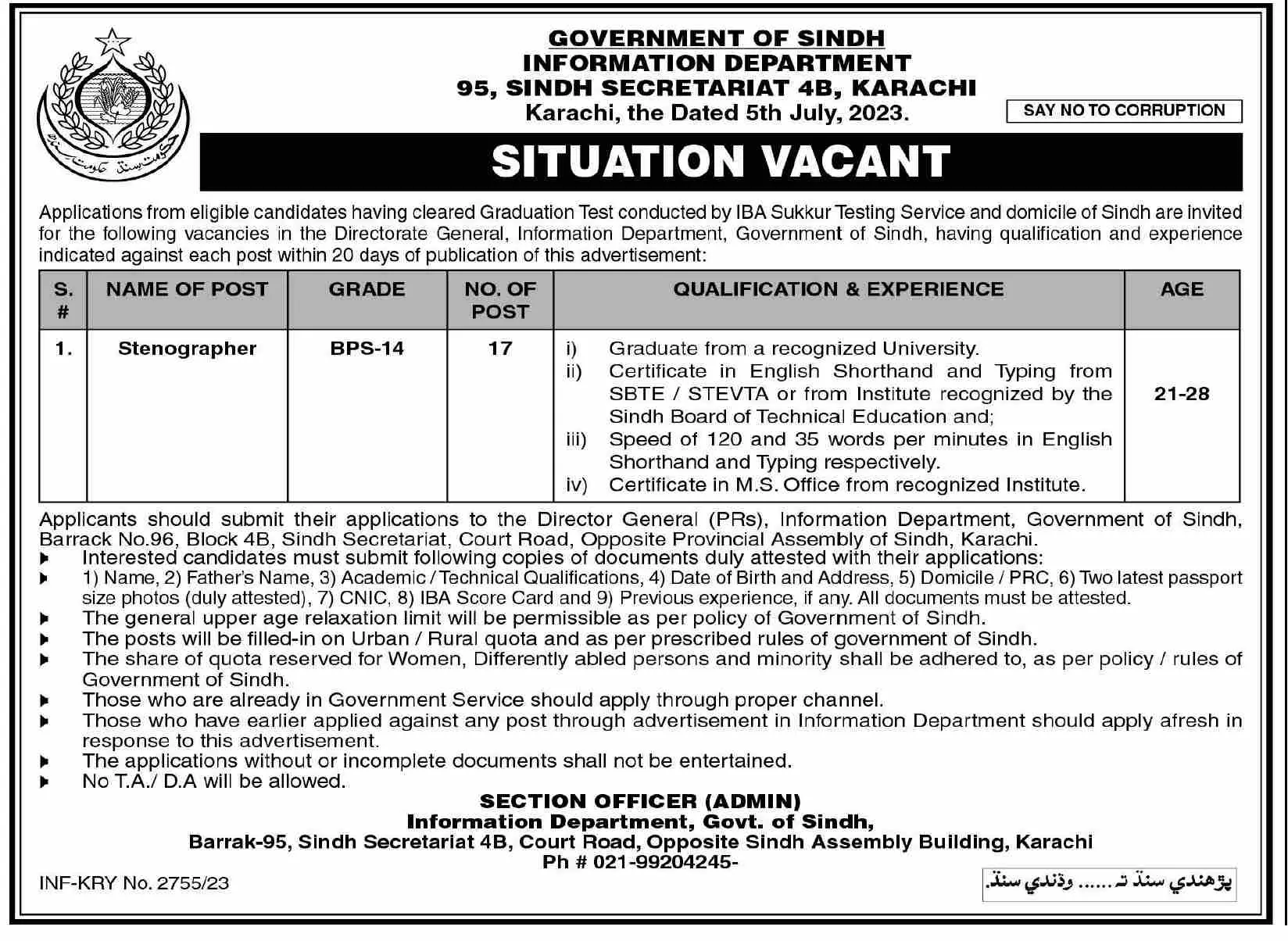 Information Department Sindh Karachi Jobs 2023 announce the Contract career opportunities for the post of See Below Ad in Sindh, Karachi for the fresh and experienced candidates on Contract basis who have Check Advertisement degree. Posted date of this post is 06/07/2023 and the last date is 26/07/2023. if you are eligible for this job apply before due date.
