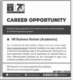 For a detailed job description, please visit our career page. Interested candidates must apply online within 15 days from the publication date of this advertisement. IBA Karachi is an equal opportunity employer and all applications are assessed based on merit. Differently-abled individuals are also encouraged to apply. Only shortlisted candidates will be contacted for an interview.