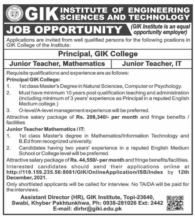 Institute of Engineering Sciences And Technology Sawabi Job announce the Contract career opportunities for the post of See Below Ad in Khyber Pakhtunkhwa,Swabi for the fresh and experienced candidates on Contract basis who have Check Advertisement degree. Posted date of this post is 04/12/2021 and the last date is 12/12/2021. if you are eligible for this job apply before due date.