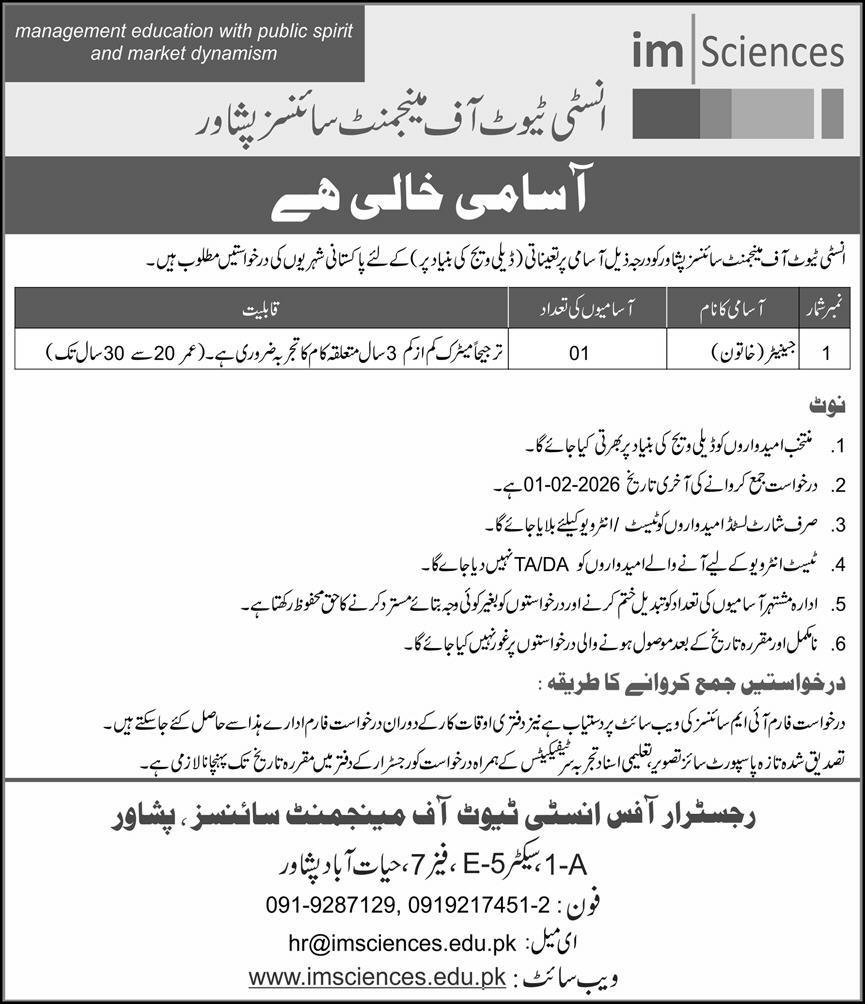 Institute Of Management Sciences IMSciences Jobs 2026 announce the Contract career opportunities for the post of See Below Ad in Khyber Pakhtunkhwa, Peshawar for the fresh and experienced candidates on Contract basis who have Check Advertisement degree. Posted date of this post is 24/01/2026 and the last date is 01/02/2026. if you are eligible for this job apply before due date.