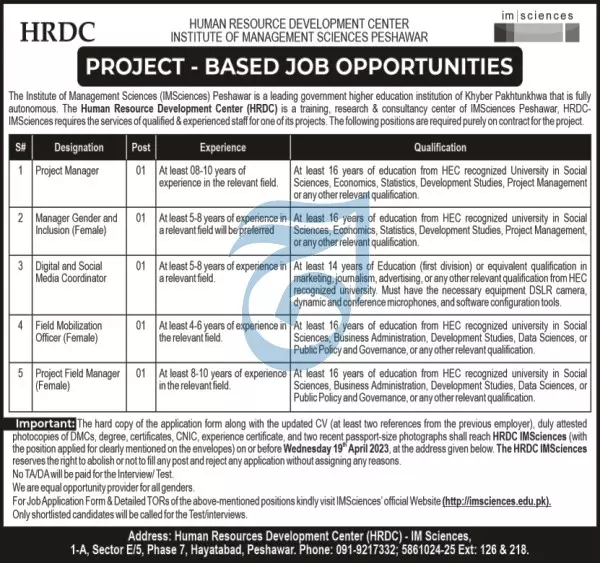 - Interested candidates may also forward their application through the postal service to the HRDC – Institute of Management Sciences, 1-A, Sector E-5, Phase VII, Hayatabad, Peshawar.