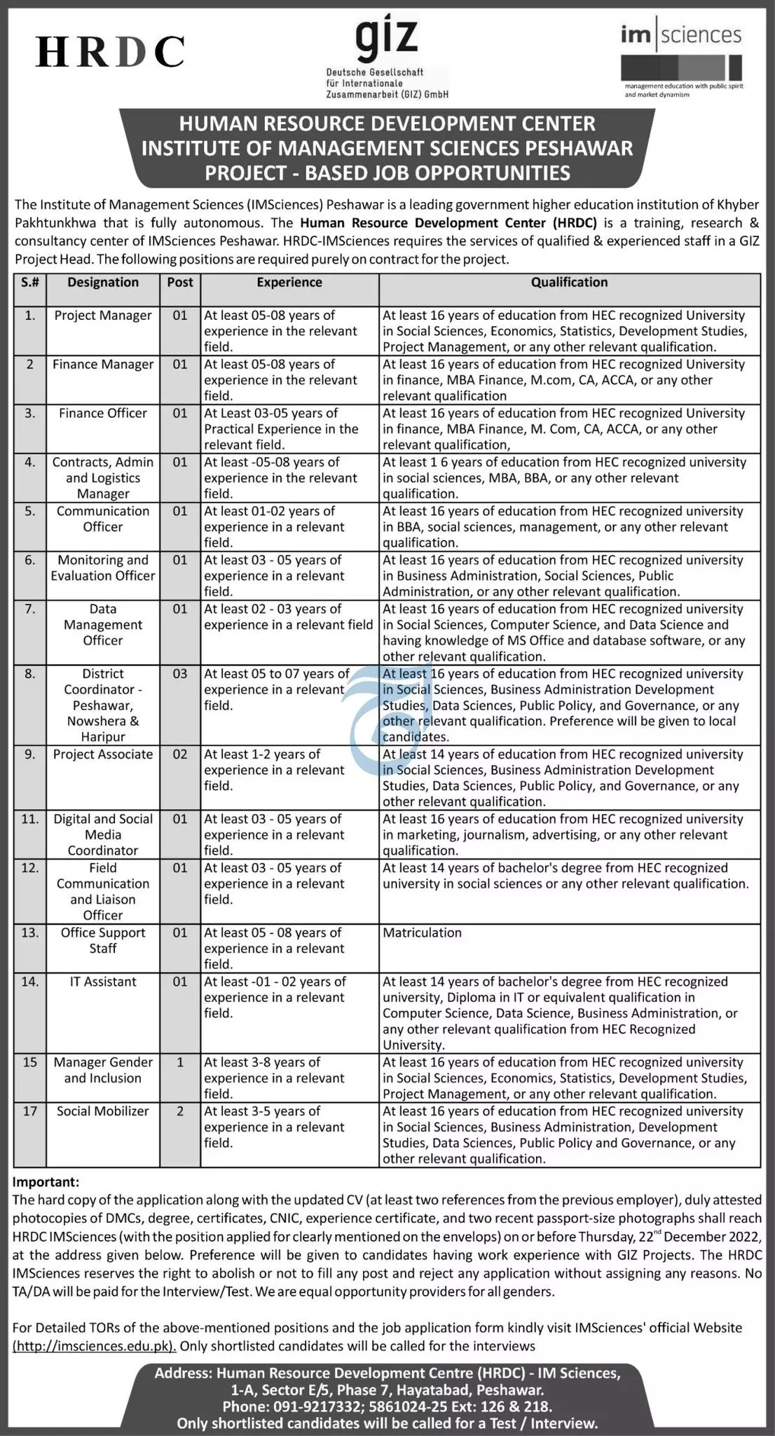 Institute of Mangement Peshawar Jobs 2022 announce the Contract career opportunities for the post of See Below Ad in Khyber Pakhtunkhwa, Peshawar for the fresh and experienced candidates on Contract basis who have Check Advertisement degree. Posted date of this post is 08/12/2022 and the last date is 22/12/2022. if you are eligible for this job apply before due date.