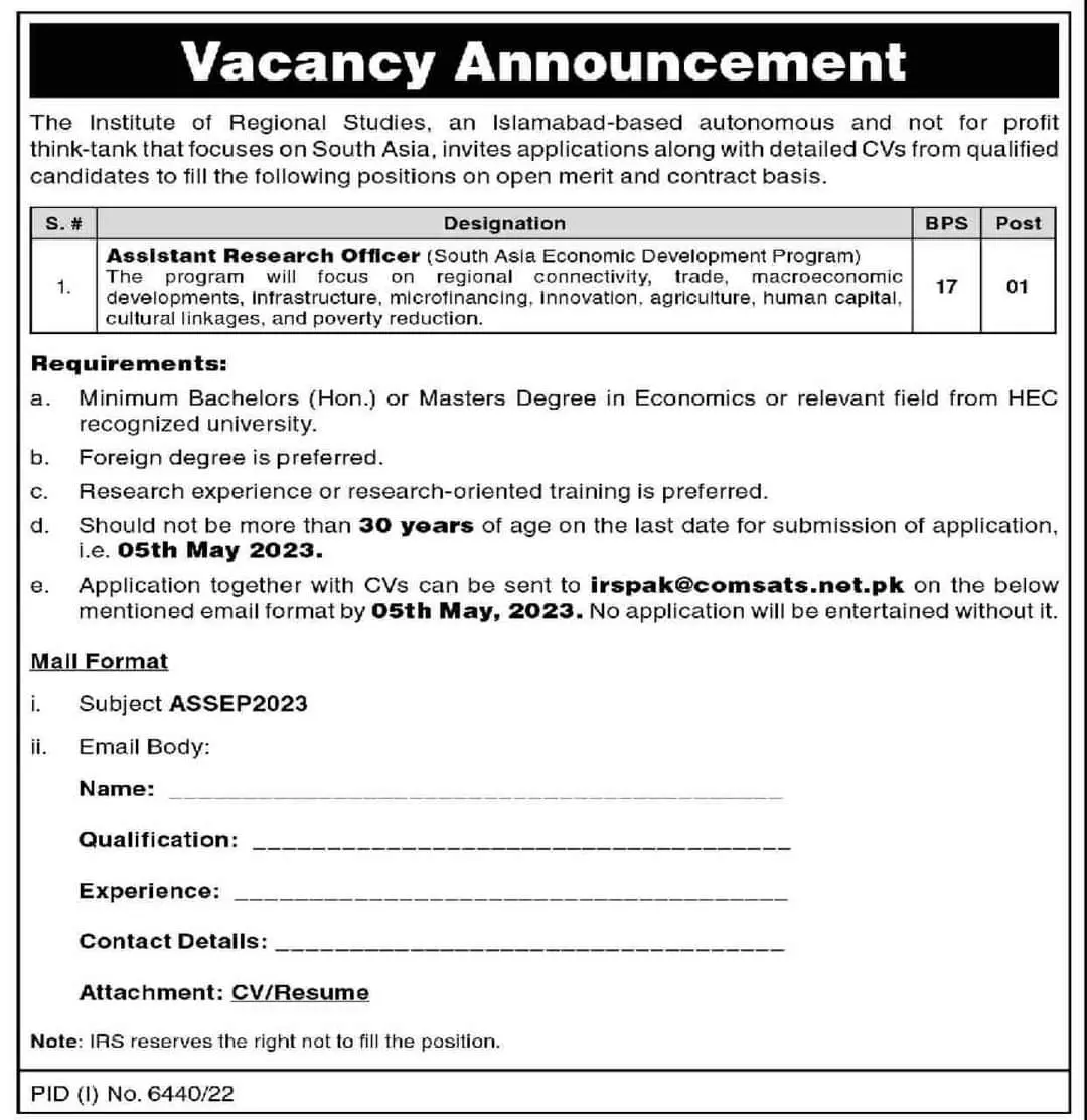 Institute of Regional Studies Islamabad Jobs announce the career opportunities for the post of in for the fresh and experienced candidates on basis who have degree. Posted date of this post is 22/04/2023 and the last date is 05/05/2023. if you are eligible for this job apply before due date.