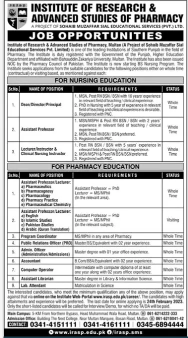 - Institute of Research & Advanced Studies of Phamcay IRASP jobs advertisement dated about 22 May 2022 in daily Jang Newspaper invites application for the vacant post of laboratory attendant, professor chairman, administration officer, librarian, admin officer, assistant professor, admission officer and lecturer in Multan, multan Punjab Pakistan. Persons with Master, Intermediate and Phd etc. education can apply.