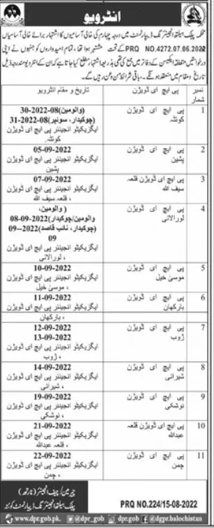 Interview in Public Health Engineering Department Quetta announce the Contract career opportunities for the post of See Below Ad in Balochistan, Quetta for the fresh and experienced candidates on Contract basis who have Check Advertisement degree. Posted date of this post is 16/08/2022 and the last date is 22/09/2022. if you are eligible for this job apply before due date.