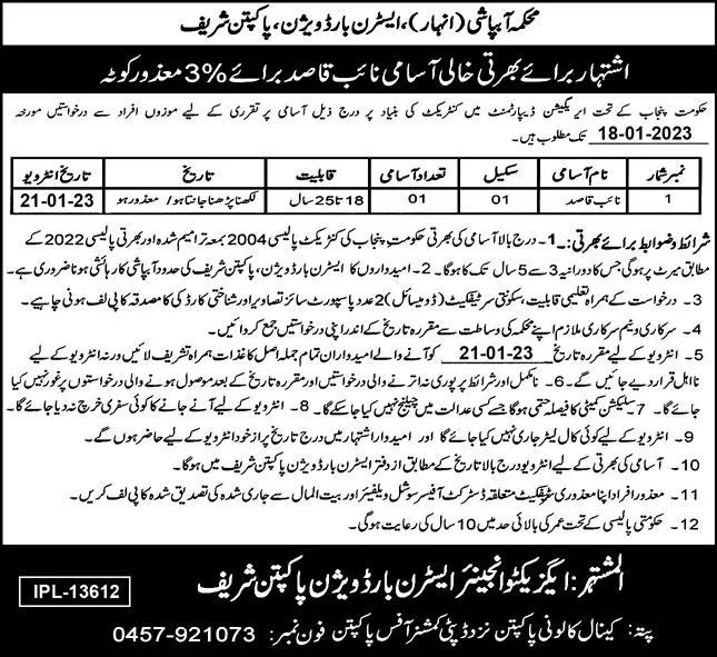 Irrigation Department Punjab Jobs 2023 announce the Contract career opportunities for the post of See Below Ad in Punjab, Pakpattan for the fresh and experienced candidates on Contract basis who have Check Advertisement degree. Posted date of this post is 30/12/2022 and the last date is 21/01/2023. if you are eligible for this job apply before due date.