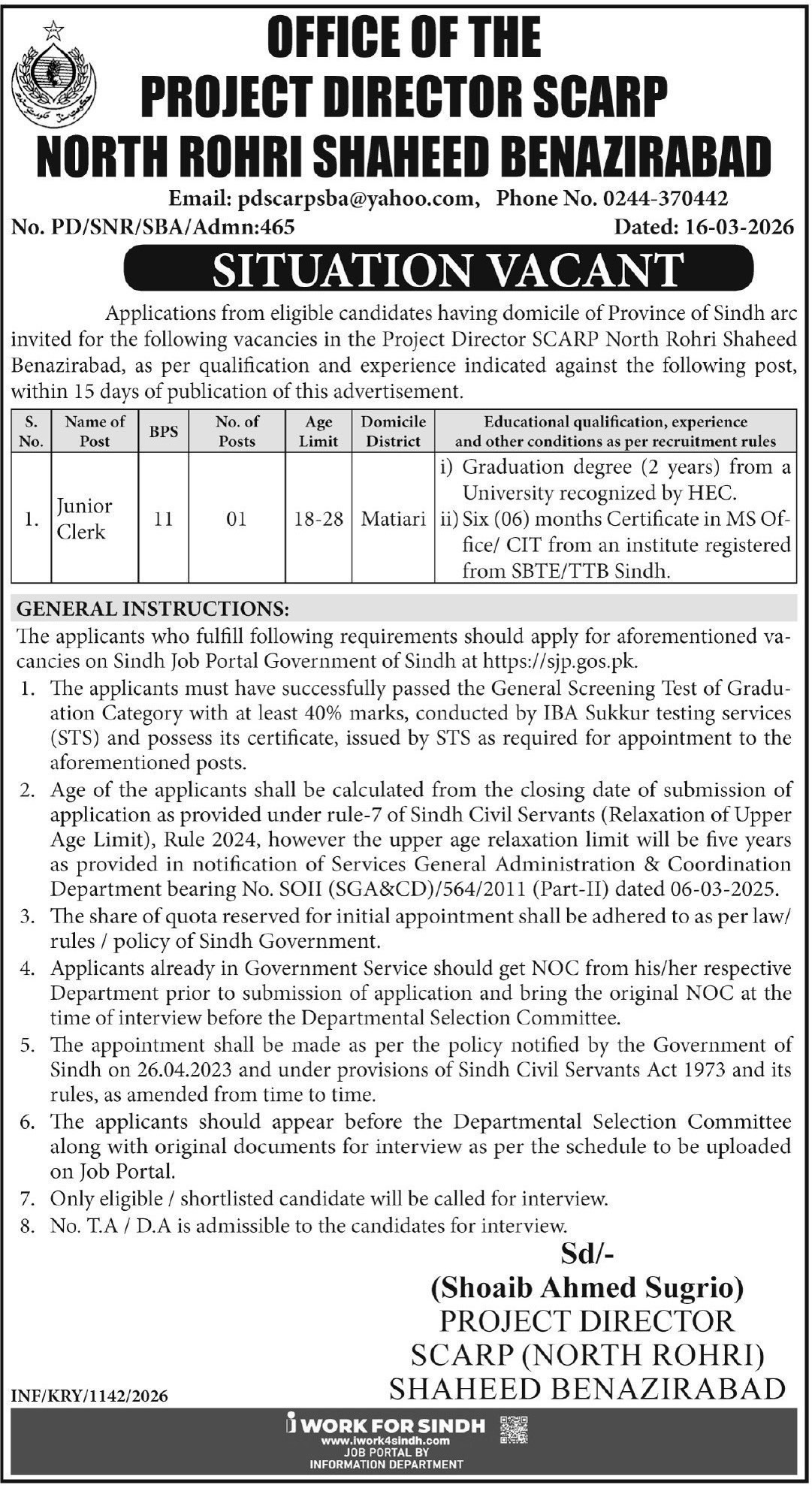 Irrigation SCARP North Rohri Shaheed Benazirabad Jobs 2026 announce the Contract career opportunities for the post of See Below Ad in Sindh, Shaheed Benazirabad for the fresh and experienced candidates on Contract basis who have Check Advertisement degree. Posted date of this post is 19/03/2026 and the last date is 02/04/2026. if you are eligible for this job apply before due date.