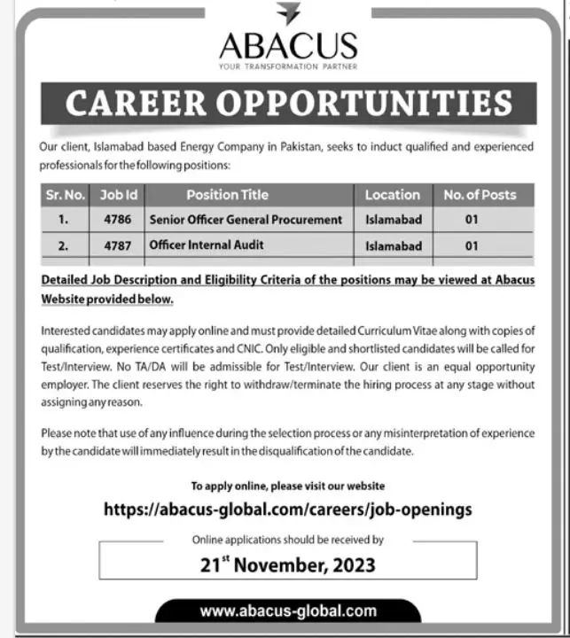 Islamabad Based Energy Company Jobs 2023 announce the Contract career opportunities for the post of See Below Ad in Federal, Islamabad for the fresh and experienced candidates on Contract basis who have Check Advertisement degree. Posted date of this post is 05/11/2023 and the last date is 21/11/2023. if you are eligible for this job apply before due date.
