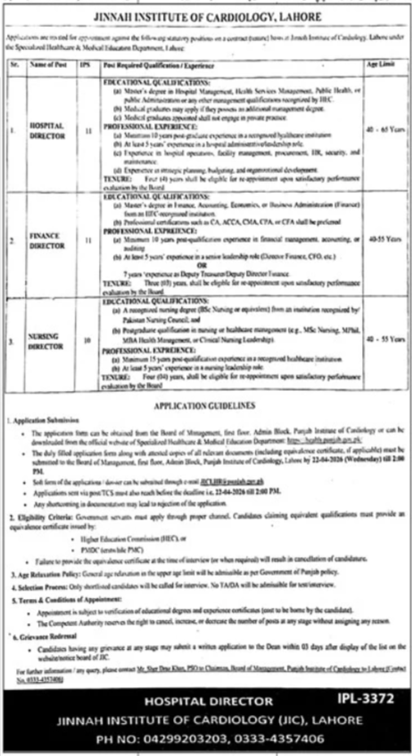 Jinnah Institute Of Cardiology JIC Jobs 2026 announce the Contract career opportunities for the post of See Below Ad in Punjab, Lahore for the fresh and experienced candidates on Contract basis who have Check Advertisement degree. Posted date of this post is 08/04/2026 and the last date is 22/04/2026. if you are eligible for this job apply before due date.