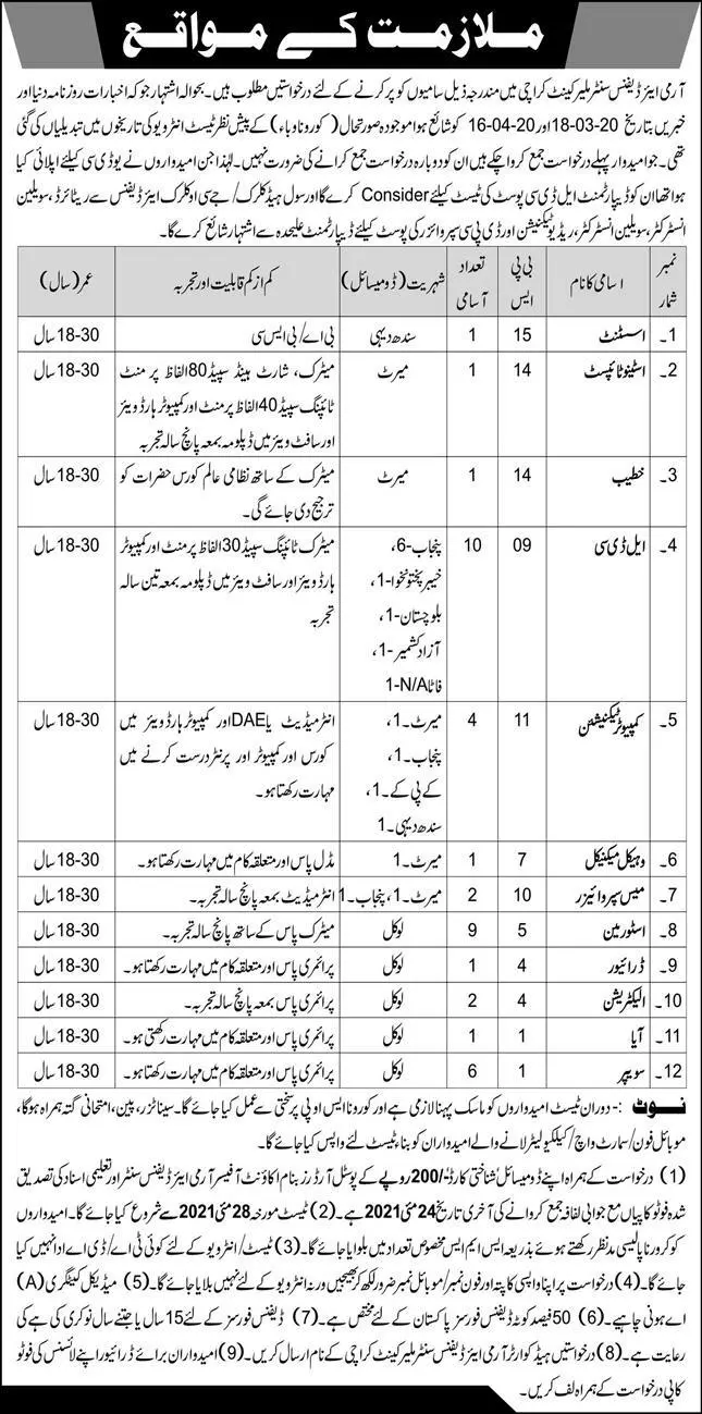 Jobs Army Air Defence Center Karachi announce the career opportunities for the post of in for the fresh and experienced candidates on basis who have degree. Posted date of this post is 12/05/2021 and the last date is 24/05/2021. if you are eligible for this job apply before due date.
