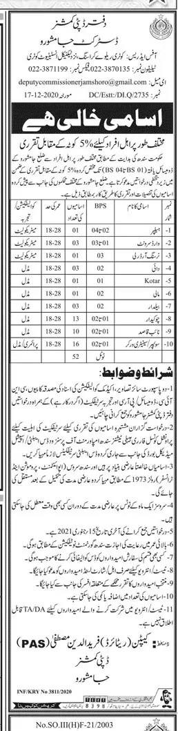 Jobs Deputy Commission Office Jam Shoro announce the career opportunities for the post of in for the fresh and experienced candidates on basis who have degree. Posted date of this post is 31/12/2020 and the last date is 15/01/2021. if you are eligible for this job apply before due date.