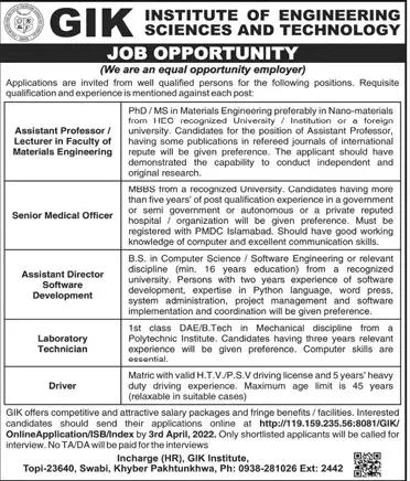 Jobs GIK Institute of Engineering and Technology Sawabi