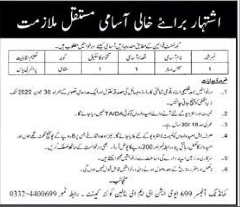 Jobs in 699 Aviation EME Battalion Quetta 2022 announce the Permanent career opportunities for the post of See Below Ad in Balochistan, Quetta for the fresh and experienced candidates on Permanent basis who have Check Advertisement degree. Posted date of this post is 20/06/2022 and the last date is 30/06/2022. if you are eligible for this job apply before due date.