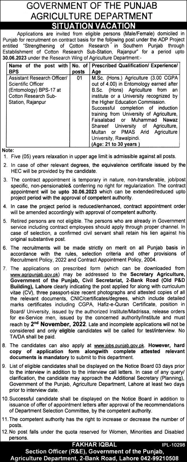 - Agriculture Department jobs advertisement dated about 14 October 2022 in daily Express Newspaper invites application for the vacant post of assistant research officer in Lahore, lahore Punjab Pakistan.