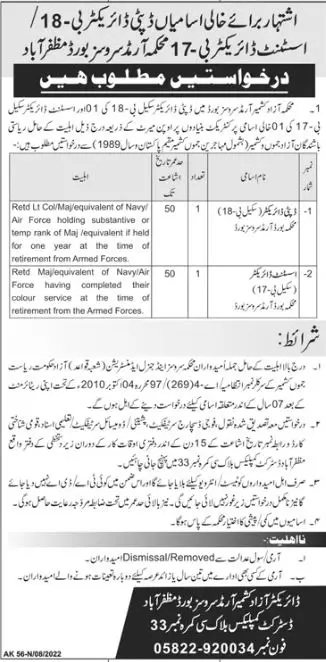 Vacant posts including deputy director and assistant director are announced in Armed Services Board Department Muzaffarabad, muzaffarabad AJK Pakistan as per 25 August 2022 advertisement in daily Jang Newspaper. Master and Bachelor etc. educational qualification will be preferred.