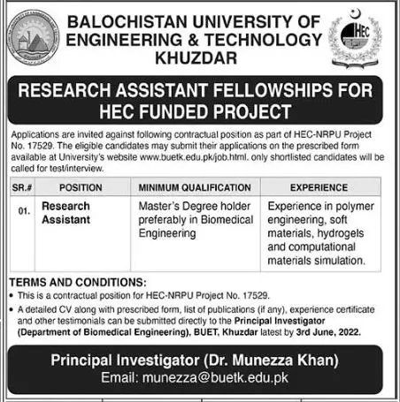 Jobs in Balochistan University of Engineering And Technology announce the Contract career opportunities for the post of See Below Ad in Balochistan, Khuzdar for the fresh and experienced candidates on Contract basis who have Check Advertisement degree. Posted date of this post is 27/05/2022 and the last date is 03/06/2022. if you are eligible for this job apply before due date.