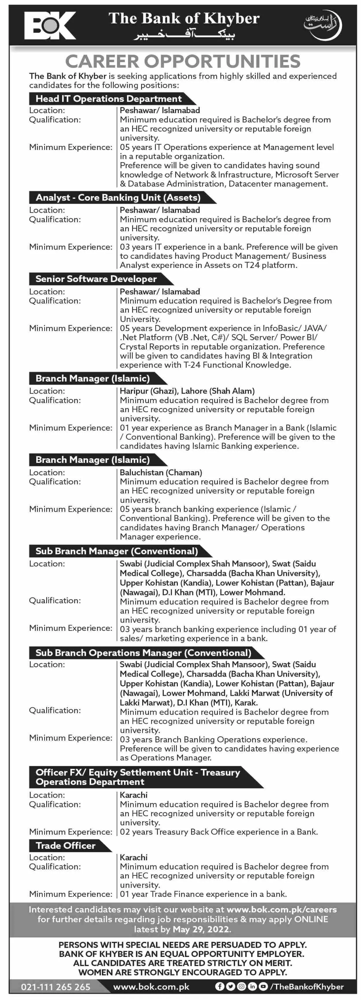 Jobs In Bank Of Khyber announce the Contract career opportunities for the post of See Below Ad in Khyber Pakhtunkhwa for the fresh and experienced candidates on Contract basis who have Check Advertisement degree. Posted date of this post is 15/05/2022 and the last date is 29/05/2022. if you are eligible for this job apply before due date.