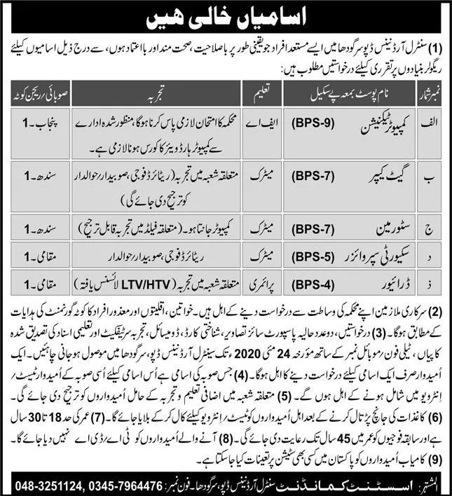 Central Ordnance Depot Sargodha announce the full-time career opportunities for the post of Driver,Storeman,Gate Keeper,Security Supervisor,Computer Technician in Sargodha city, Punjab, Pakistan for the fresh and experienced candidates on Permanent basis who have Intermediate degree . Posted date of this post is 11-05-2020 and the last date is 24-05-2020. If you are eligible for this job apply before the due date
