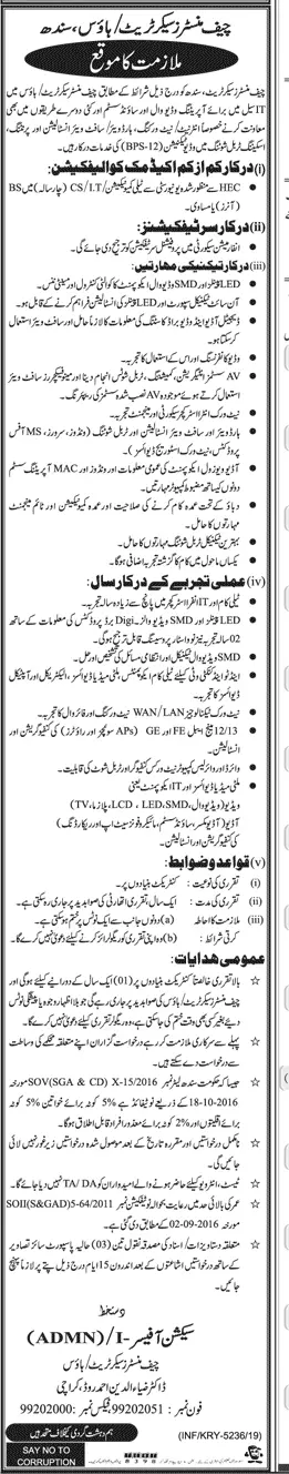 Chief Ministers Secretariat House Karachi Jobs 2025
