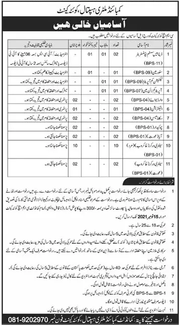 Jobs in Combined Military Hospital Quetta announce the Contract career opportunities for the post of See Below Ad in Balochistan,Quetta for the fresh and experienced candidates on Contract basis who have Check Advertisement degree. Posted date of this post is 31/10/2021 and the last date is 15/11/2021. if you are eligible for this job apply before due date.