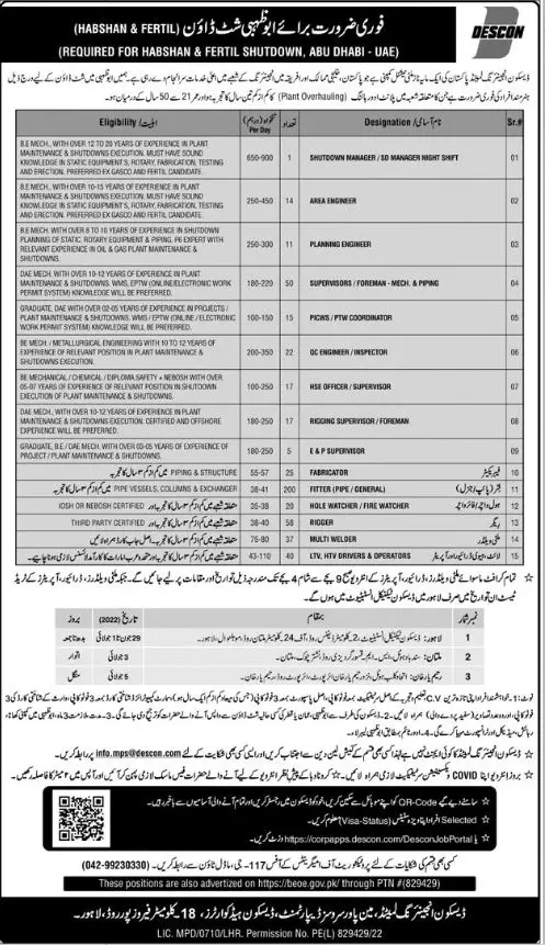 Jobs in Descon Engineering Limited Pakistan announce the Contract career opportunities for the post of See Below Ad in Punjab, Lahore for the fresh and experienced candidates on Contract basis who have Check Advertisement degree. Posted date of this post is 19/06/2022 and the last date is 05/07/2022. if you are eligible for this job apply before due date.
