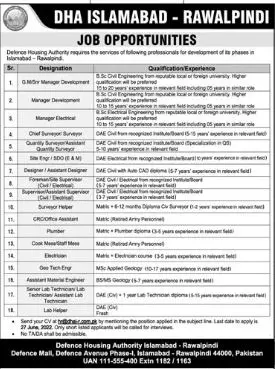 Jobs in DHA Islamabad Rawalpindi announce the Contract career opportunities for the post of See Below Ad in Federal, Islamabad for the fresh and experienced candidates on Contract basis who have Check Advertisement degree. Posted date of this post is 17/06/2022 and the last date is 27/06/2022. if you are eligible for this job apply before due date.