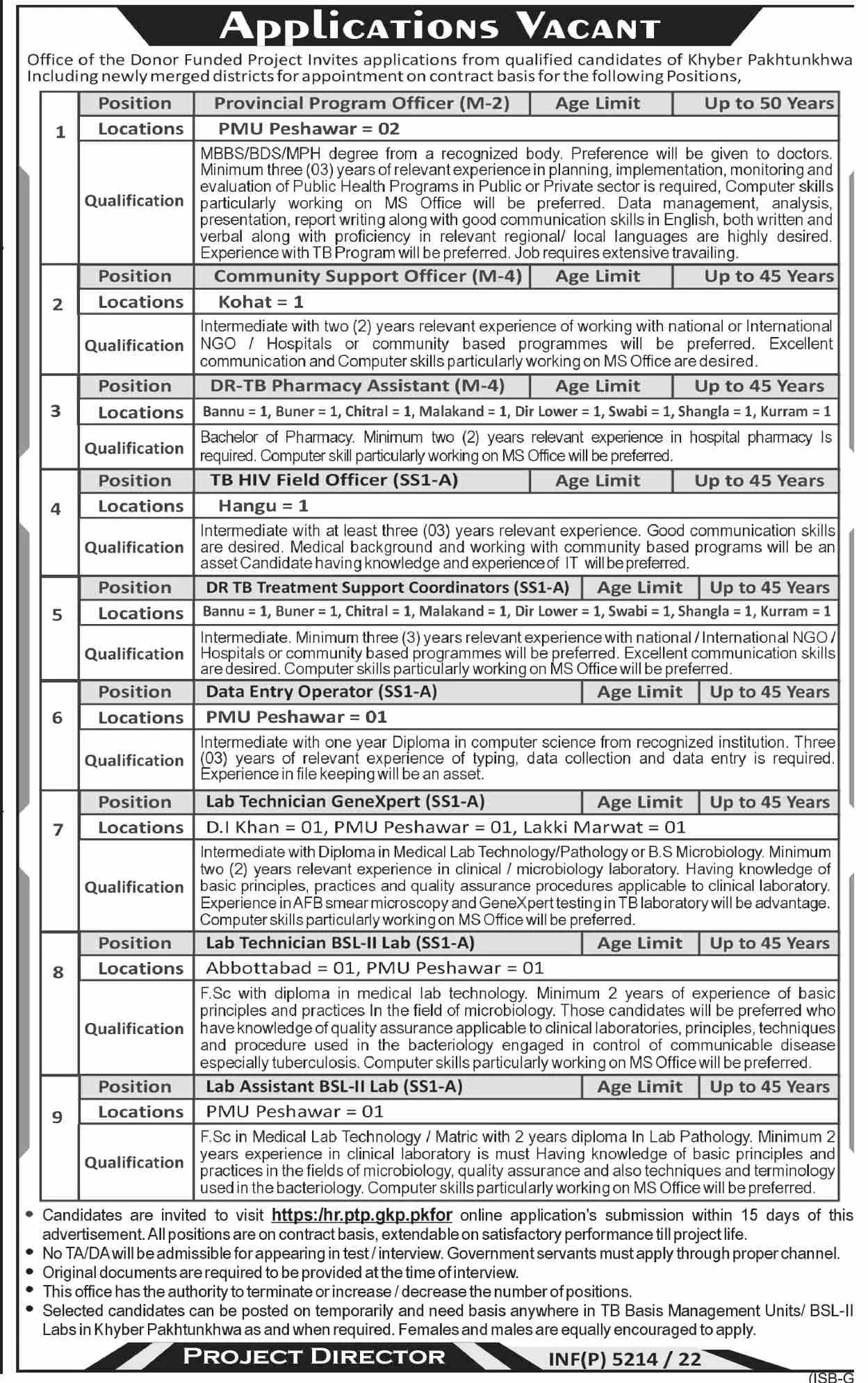 - Donor Funded Project is looking for services from experienced candidates for the posts of Community Support Officer,Lab Technician Bsl,Data Entry Operator,Provincial Program Officer,Pharmacy Assistant,Tb Hiv Field Officer,Dr Tb Treatment Support Coordinator,Lab Technician Gener Xpert,Lab Assistant Bsl to enhance the progress of the Donor Funded Project.